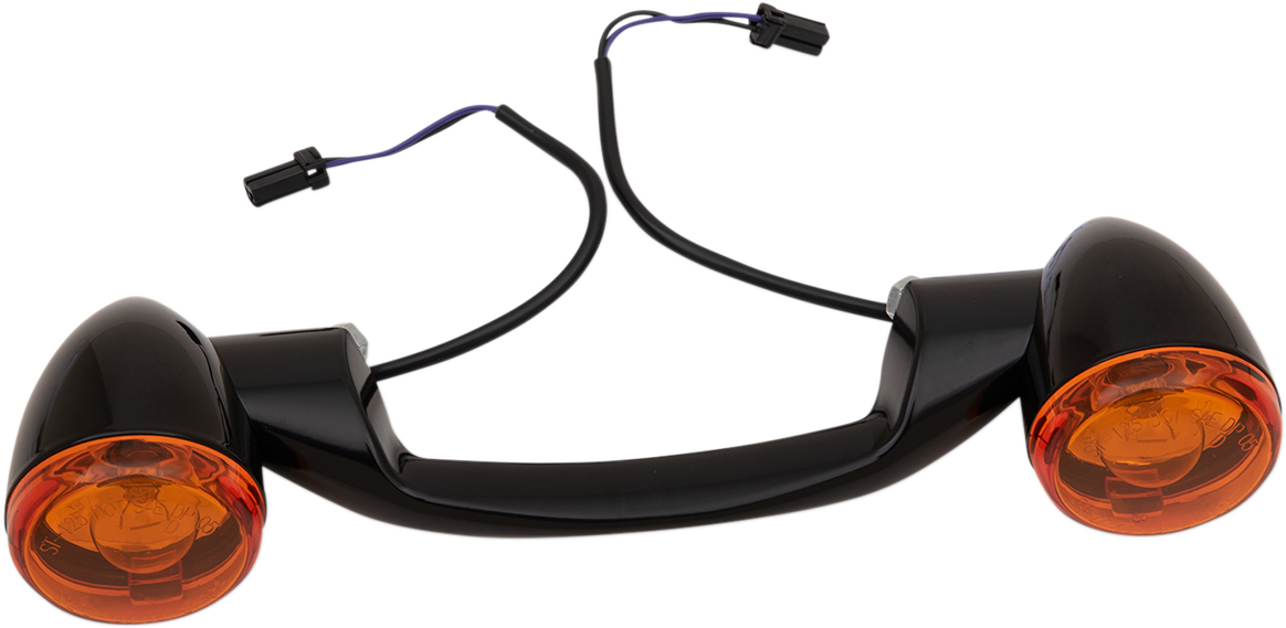 - Kit features a narrow profile black mounting bar and bullet-style rear turn signal with amber lenses