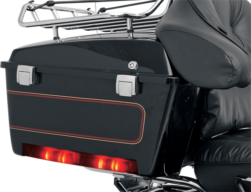 Chrome housing with red lens and top tag light Includes a top license plate mount Lens measures 4-5/8" x 2-1/2" Dual-function LED 41/4"...