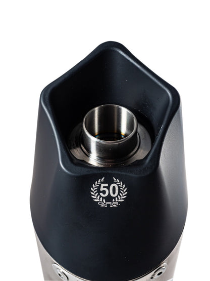 GPR's GP Anniversary Titanium was created to celebrate the 50th GPR anniversary in 2018. It has a black titanium body, avional caps made through CNC machining, and a pentagonal exit. Its round cone shape measures 3.5 inches x 5.1 inches (90 MM x 130 MM).